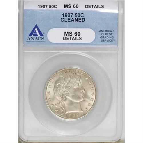<B>1907 50C --Cleaned--ANACS. MS60 Details.</B></I> Considerable patience and a strong loupe eventually locates a few completely trivial obverse hairlines. This lustrous Barber half has incompleteness of strike from the right shield corner to the fletchings, and the portrait has a few faint grazes.<BR><BR><B>Coin Engraver:</B> Charles E. Barber<BR><BR><b>Shipping:</b> Coins & Currency (<a target="_blank" href="http://www.heritageauctions.com/common/shipping.php">view shipping information</a>)