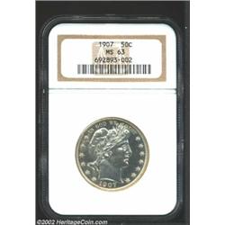 1907 50C MS63 NGC. A brilliant and mildly prooflike representative that has a couple of luster graze
