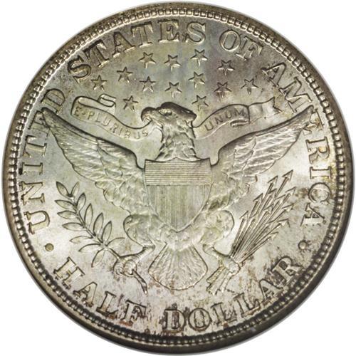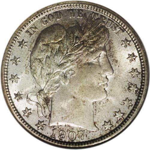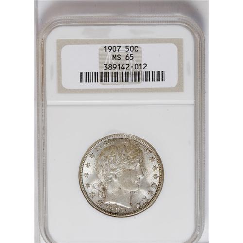 <B>1907<50C> MS65 NGC.</B></I> Despite its high mintage (over 2.5 million examples), the 1907 is a condition rarity in Gem and higher grades. The design elements are sharply struck throughout. This is a highly lustrous piece that has powder-blue and champagne patina with specks of reddish-brown toning. The only mark of note is a small abrasion on the cheek of Liberty, but magnification is required to locate this minor flaw. Census: 19 in 65, 1 finer (8/06).