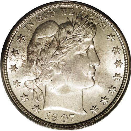 <B>1907<50C> MS65 PCGS.</B></I> Ex: Pryor Collection. Splendidly sharp striking details are evident throughout, on both sides of this lustrous, shimmering Gem. Small amounts of speckled olive and reddish-tan patina dot the otherwise silver-gray surfaces. Well preserved and nearly blemish-free, a technically impressive example. Population: 22 in 65, 3 finer (4/06).<BR><I>Ex: James Bennett Pryor Collection (Bowers and Merena, 1/96), lot 301; purchased by Pryor from Joel Rettew, February 19, 1976.</B></I>