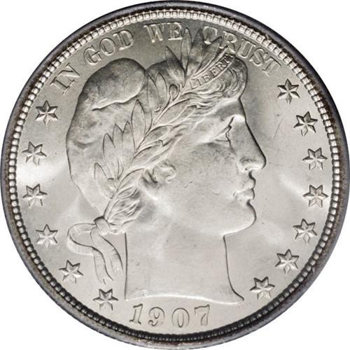 <B>1907 50C MS65 PCGS.</B></I> Satiny white luster with just a touch of haze over the surfaces. The strike is bold on the arrow feathers and right claw of the eagle. A couple of minor specks are present, one above the date, another near the top of the shield. One tiny nick on Liberty's cheek, and a few minor luster grazes from a higher grade. Population: 22 in 65, 3 finer (1/06).