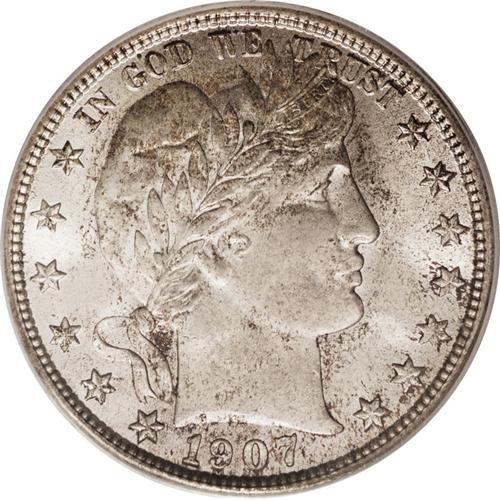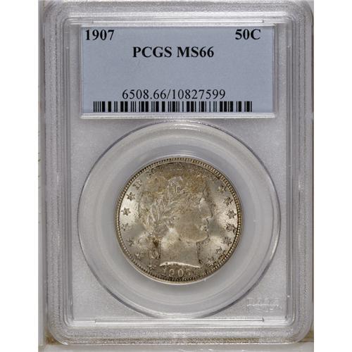 <B>1907 50C MS66 PCGS.</B></I> Collectors of Mint State Barber half dollars understand just how much effort is required to locate attractive Gem quality examples. Even the most common dates are elusive in the highest grades. This 1907 is a perfect example, with a mintage exceeding 2.5 million coins, yet just 29 pieces have been certified as MS65 or finer. This piece is sharply struck with exceptional ivory luster with speckled yellow and brown toning. Population: 2 in 66, 1 finer (10/06).<BR><BR><b>Shipping:</b> Coin/Currency (<a target="_blank" href="http://www.heritageauctions.com/common/shipping.php">view shipping information</a>)