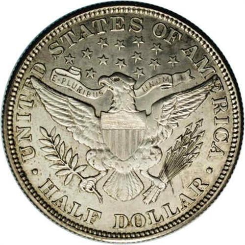 <B>1907<50C> PR62 NGC.</B></I> Well struck and nicely preserved, with faint cloudiness in the fields and mottled light-green and olive-russet patina near the borders. A few faint slide marks on the obverse restrict the grade, along with noticeable striking weakness on the eagle.