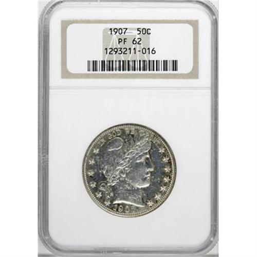 <B>1907 50C PR62 NGC.</B></I> Hints of champagne toning grace the otherwise silver-white surfaces of this boldly impressed proof Barber half. Dots of milk-white and jet-black patina appear at the margins as well. Scattered hairlines preclude Select status.<BR><BR><B>Coin Engraver:</B> Charles E. Barber<BR><BR><b>Shipping:</b> Coins & Currency (<a target="_blank" href="http://www.heritageauctions.com/common/shipping.php">view shipping information</a>)
