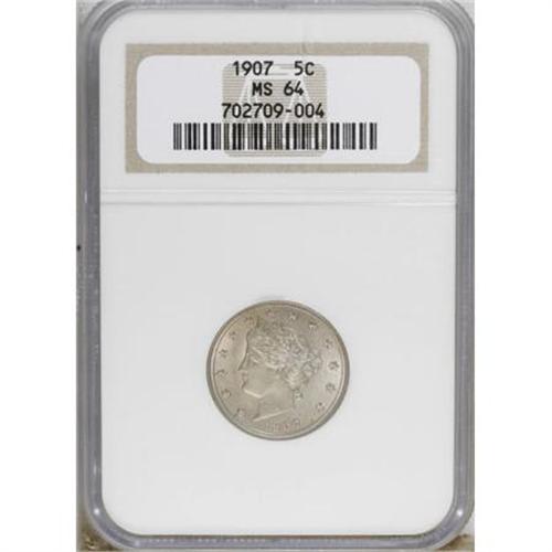 <B>1907 5C MS64 NGC.</B></I> NGC Census: (187/77). PCGS Population (211/101). Mintage: 39,214,800. Numismedia Wsl. Price for NGC/PCGS coin in MS64: $180. (#3868)<BR><BR><B>Coin Engraver:</B> Charles E. Barber<BR><BR><b>Shipping:</b> Coins & Currency (<a target="_blank" href="http://www.heritageauctions.com/common/shipping.php">view shipping information</a>)