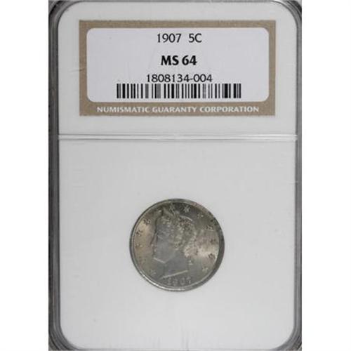 <B>1907 5C MS64 NGC.</B></I> NGC Census: (187/77). PCGS Population (213/105). Mintage: 39,214,800. Numismedia Wsl. Price for NGC/PCGS coin in MS64: $180. (#3868)<BR><BR><B>Coin Engraver:</B> Charles E. Barber<BR><BR><b>Shipping:</b> Coins & Currency (<a target="_blank" href="http://www.heritageauctions.com/common/shipping.php">view shipping information</a>)