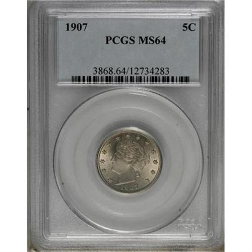 <B>1907 5C MS64 PCGS.</B></I> PCGS Population (218/110). NGC Census: (189/80). Mintage: 39,214,800. Numismedia Wsl. Price for NGC/PCGS coin in MS64: $185. (#3868)<BR><BR><B>Coin Engraver:</B> Charles E. Barber<BR><BR><b>Shipping:</b> Coins & Currency (<a target="_blank" href="http://www.heritageauctions.com/common/shipping.php">view shipping information</a>)