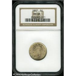 1907 5C MS65 NGC. Nicely struck, save for the whea <B>1907 5C MS65 NGC.</B></I> Nicely struck, save for the wheat and corn kernels to the left of the bow knot. Nickel-gray surfaces reveal nice luster, and just a few minor marks on Liberty's cheek. Population: 64 in 65, 10 finer (11/04). <BR><BR><B>Important notice:</B> Heritage usually auctions material at the rate of 200-250 lots per hour. On some occasions eBay Live bid software or the Internet may not be able to keep up with the pace of the auction. We recommend placing a realistic absentee bid now as insurance to avoid disappointment. Occasionally the auctioneer may eliminate or reject an eBay Live bid, and the auctioneer may also reopen a lot after the close of the eBay live bidding (usually because we missed an audience bid), and may reject your bid even if it shows you as the winning bidder. By bidding via eBay Live, you agree that Heritage may award the lot to another bidder at its sole discretion under the circumstances described above or any other reasonable circumstances. Since eBay bids are not shown to us until we open the lot on the floor, we treat those bids just like floor bids. In most cases the floor responds before the eBay bid is presented to us, due to Internet lag time, so for consistency we have made it a policy that floor bids are always considered first over tie eBay live bids. Also please note that all Heritage lots purchased through eBay Live carry a 20% Buyer's Premium. Please make sure you read the Terms and Conditions before you bid. This lot is being auctioned in conjunction with a live floor auction by Heritage Galleries & Auctioneers. All final auction and invoice information will be supplied by Heritage Galleries & Auctioneers, and all other information should be considered preliminary. Lot:5534
