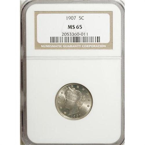 <B>1907 5C MS65 NGC.</B></I> NGC Census: (66/11). PCGS Population (81/24). Mintage: 39,214,800. Numismedia Wsl. Price for NGC/PCGS coin in MS65: $1,000. (#3868)<BR><BR><B>Coin Engraver:</B> Charles E. Barber<BR><BR><b>Shipping:</b> Coins & Currency (<a target="_blank" href="http://www.heritageauctions.com/common/shipping.php">view shipping information</a>)
