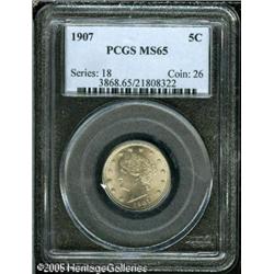 <B>1907 5C MS65 PCGS.</B></I> Dazzling cartwheel luster flashes from each side of this well preserved Gem. Boldly struck with lovely golden toning on the reverse, where a few scattered contact marks can be seen under close examination. Population: 51 in 65, 14 finer (1/05). Lot:5895