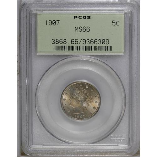 1907 5C MS66 PCGS. Bright and lustrous with slight, ty