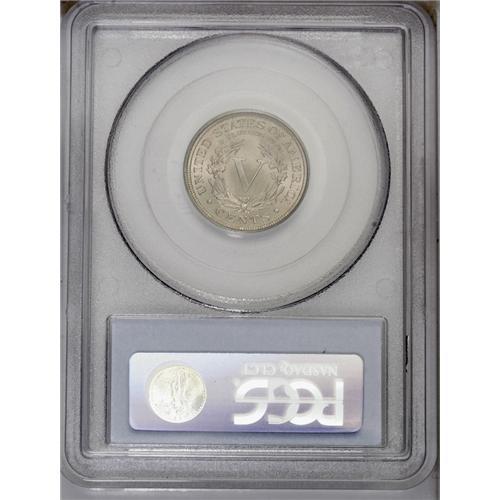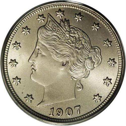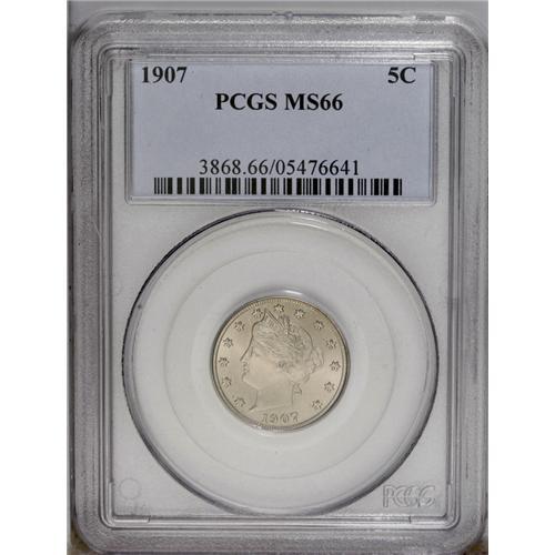 <B>1907<5C> MS66 PCGS.</B></I> Highly attractive with frosty grayish-gold surfaces and full luster. Sharply struck although the ear of corn at the lower left part of the wreath is flat as usual. This amazing nickel has very few peers, and it is unsurpassed for grade by any other examples that have been certified. Population: 18 in 66, 0 finer (3/06). <BR><BR><B>Important notice:</B> Heritage usually auctions material at the rate of 200-250 lots per hour. On some occasions eBay Live bid software or the Internet may not be able to keep up with the pace of the auction. We recommend placing a realistic absentee bid now as insurance to avoid disappointment. Occasionally the auctioneer may eliminate or reject an eBay Live bid, and the auctioneer may also reopen a lot after the close of the eBay live bidding (usually because we missed an audience bid), and may reject your bid even if it shows you as the winning bidder. By bidding via eBay Live, you agree that Heritage may award the lot to another bidder at its sole discretion under the circumstances described above or any other reasonable circumstances. Since eBay bids are not shown to us until we open the lot on the floor, we treat those bids just like floor bids. In most cases the floor responds before the eBay bid is presented to us, due to Internet lag time, so for consistency we have made it a policy that floor bids are always considered first over tie eBay live bids. Also please note that all Heritage lots purchased through eBay Live carry a 20% Buyer's Premium. Please make sure you read the Terms and Conditions before you bid. This lot is being auctioned in conjunction with a live floor auction by Heritage Galleries & Auctioneers. All final auction and invoice information will be supplied by Heritage Galleries & Auctioneers, and all other information should be considered preliminary. Lot:957 <BR><BR><B>Winning Notification and Billing:</B> After the FINAL session in this auction is complete, Heritage will send e-mail and snail mail invoices. This process normally takes several days. All final auction and invoice information will be supplied by Heritage Galleries & Auctioneers, and all other information should be considered preliminary. <BR><BR>This auction will be conducted on a live auction floor and over the Internet through eBay Live. If you choose to place an absentee bid, please take a moment to <font color='#0000ff'><u><a href='http://pages.ebay.com/liveauctions/help/before/laabsentee.html'>learn how eBay Live absentee bidding works</a></u></font><font color='#000000'>