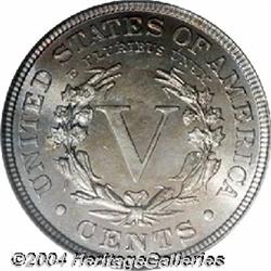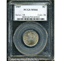 <B>1907<5C> MS66 PCGS.</B></I> An exceptionally lustrous type coin, the surfaces display lovely lilac-gray patina with accents of reddish-rose near the margins. A coin that must be seen to be fully appreciated. Population: 12 in 66, 0 finer (9/04). <BR><BR><B>Important notice:</B> Heritage usually auctions material at the rate of 200-250 lots per hour. On some occasions eBay Live bid software or the Internet may not be able to keep up with the pace of the auction. We recommend placing a realistic absentee bid now as insurance to avoid disappointment. Occasionally the auctioneer may eliminate or reject an eBay Live bid, and the auctioneer may also reopen a lot after the close of the eBay live bidding (usually because we missed an audience bid), and may reject your bid even if it shows you as the winning bidder. By bidding via eBay Live, you agree that Heritage may award the lot to another bidder at its sole discretion under the circumstances described above or any other reasonable circumstances. Since eBay bids are not shown to us until we open the lot on the floor, we treat those bids just like floor bids. In most cases the floor responds before the eBay bid is presented to us, due to Internet lag time, so for consistency we have made it a policy that floor bids are always considered first over tie eBay live bids. Also please note that all Heritage lots purchased through eBay Live carry a 20% Buyer's Premium. Please make sure you read the Terms and Conditions before you bid.