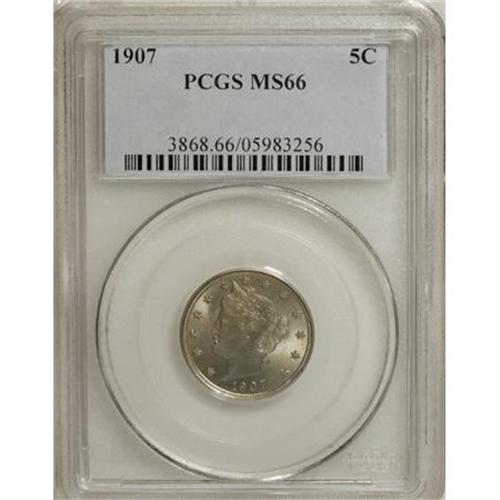 <B>1907 5C MS66 PCGS.</B></I> A subtly lustrous, and carefully preserved century-old piece, highly appealing with waves of aqua, peach, and emerald patina over each side. Well struck overall with softness noted on the stars and the lower wreath. Population: 22 in 66, 0 finer (7/07).<BR><BR><B>Coin Engraver:</B> Charles E. Barber<BR><BR><b>Shipping:</b> Coins & Currency (<a target="_blank" href="http://www.heritageauctions.com/common/shipping.php">view shipping information</a>\)