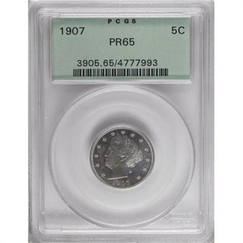 <B>1907 5C PR65 PCGS.</B></I> A solidly struck and eminently appealing Gem specimen that offers excellent reflectivity. Layers of champagne and aqua patina are the only evidence of the passage of a century. Housed in a green label holder.<BR><BR><B>Coin Engraver:</B> Charles E. Barber<BR><BR><b>Shipping:</b> Coins & Currency (<a target="_blank" href="http://www.heritageauctions.com/common/shipping.php">view shipping information</a>)