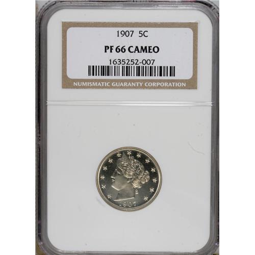 <B>1907 5C PR66 Cameo NGC.</B></I> A striking cameo with dark mirrors and dynamically frosted devices. Well struck and essentially untoned. Census: 11 in 66 Cameo, 4 finer (3/07).<BR><BR><b>Shipping:</b> Coins & Currency (<a target="_blank" href="http://www.heritageauctions.com/common/shipping.php">view shipping information</a>)