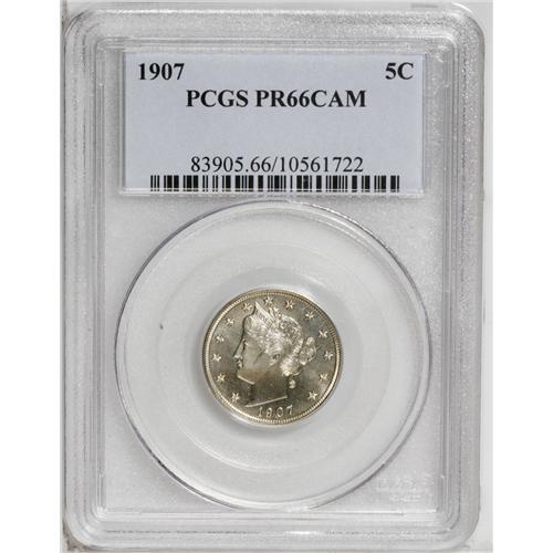 <B>1907<5C> PR66 Cameo PCGS.</B></I> A crisply struck specimen with moderate to high reflectivity to the lightly toned fields. Bold cameo contrast gives this coin great eye appeal. Population: 7 in 66 Cameo, 2 finer (7/06).