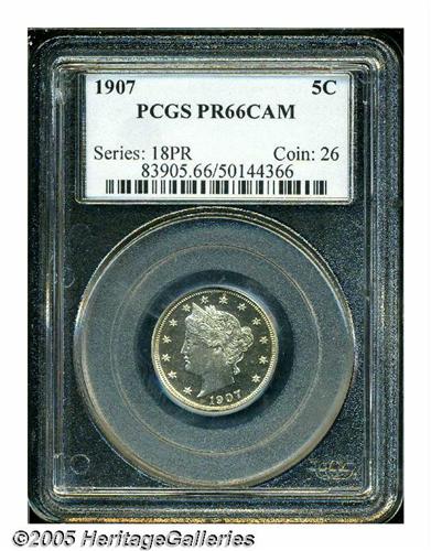 <B>1907<5C> PR66 Cameo PCGS.</B></I> This is a wonderful Cameo Proof with exquisite surfaces. Wisps of pale gold toning are visible on both sides. Few Cameo Proof examples of this date have been certified in Gem quality. Population: 6 in 66, 2 finer (5/05).