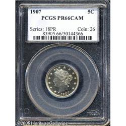 <B>1907 5C PR66 Cameo PCGS.</B></I> This is a wonderful Cameo Proof with exquisite surfaces. Wisps of pale gold toning are visible on both sides. Few Cameo Proof examples of this date have been certified in Gem quality. Population: 8 in 66, 2 finer (1/05). Lot:5945