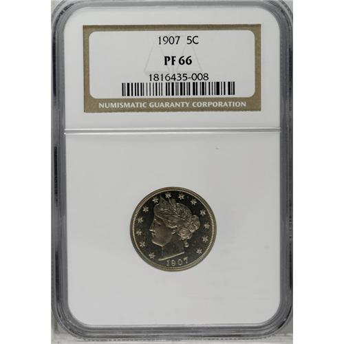 <B>1907<5C> PR66 NGC.</B></I> This date has the lowest proof production total of any Liberty nickel issue from 1883 to 1912, with just 1,475 pieces produced. It is a lovely example with light golden toning over medium gray surfaces. The devices are slightly lustrous with some cameo contrast, although not obviously so.