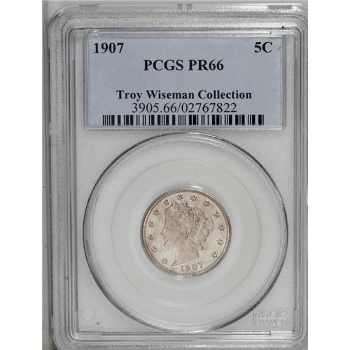 <B>1907<5C> PR66 PCGS.</B></I> A light film of gold color bathes both sides of this gorgeous, deeply mirrored proof. The strike displays great definition. Population: 27 in 66, 7 finer (7/06).<BR><I>From The Troy Wiseman Collection.</B></I>