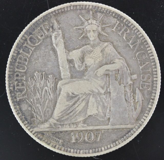 This wonderful coin is a 1907 A Republique Francaise Indo-Chine Piastre De Commerce Silver Trade Dollar. This coin is in very nice condition and would make a fantastic addition to any collection.