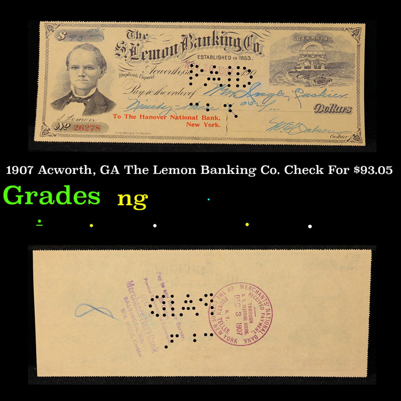 1907 Acworth, GA The Lemon Banking Co. Check For $93.05 Grades NG.