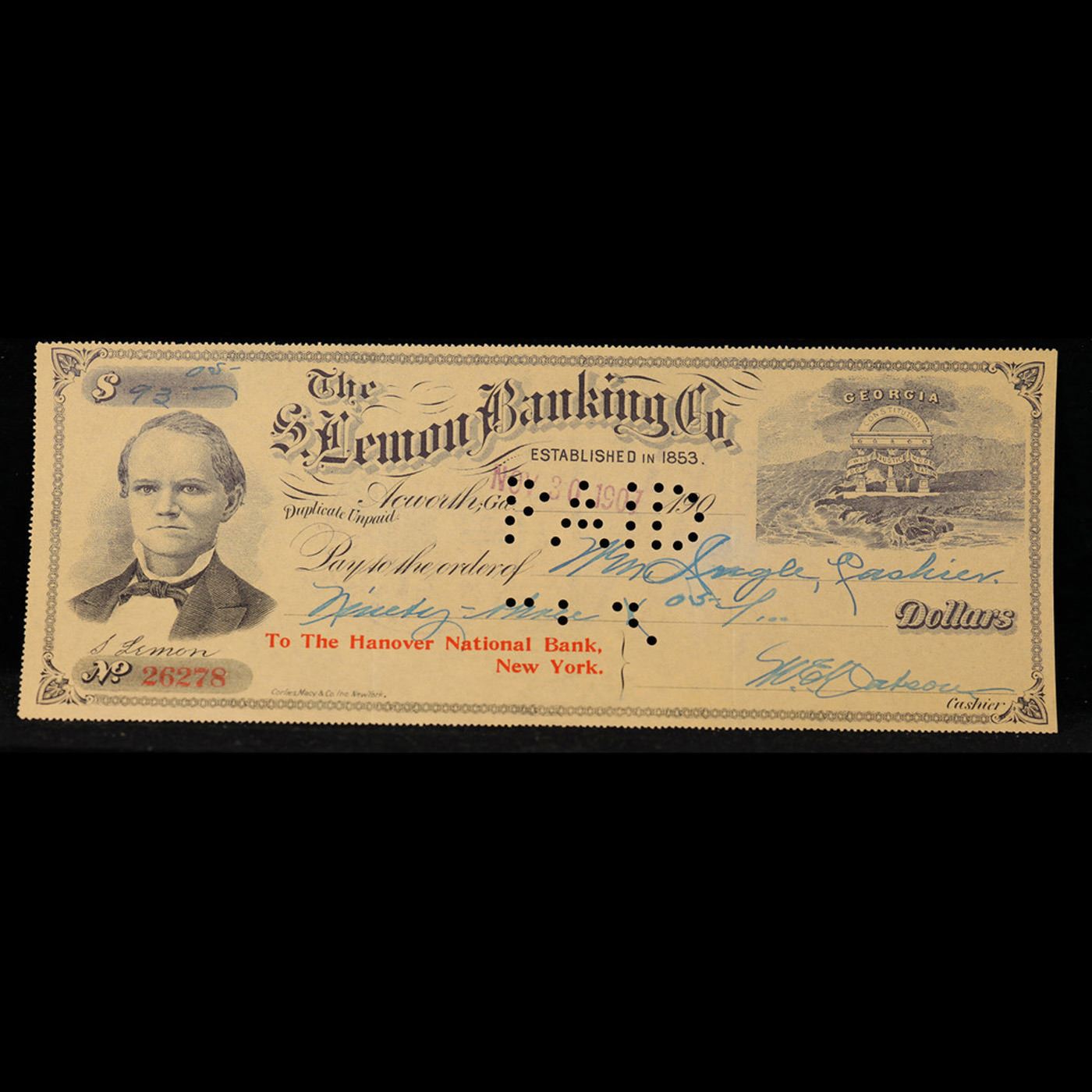 1907 Acworth, GA The Lemon Banking Co. Check For $93.05 Grades NG