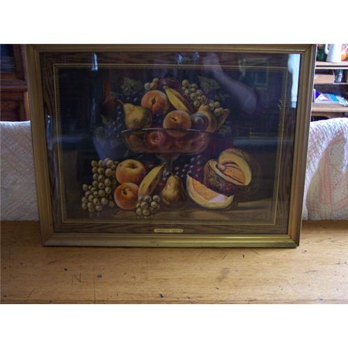 This is a very colorful fruit print in nice old frame.The frame has a couple areas on the top right side where there is paint loss.Not bad and just needs to be touched up.On the print top there are two small areas of damage (see photo)You do not notice this untill you look close.Like a tear.Also this print has some wrinkles like in it and could be taken out and flattened again.Only one area like this,not the whole print.You do not notice it when it is hanging but only when you look at it close.Bottom of picture says COPYRIGHT-1907 SACKETT & WILHELMS CO NY.The oval in the middle of the bottom says AMERICAN FRUITS.Including frame it measures 21 1/2 x16 1/2.Nice size picture.