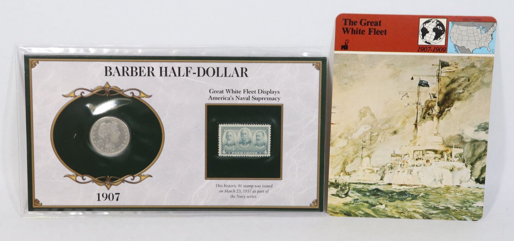 DISPLAYED ON A PANEL WITH FASCINATING INFORMATION ABOUT A MAJOR EVENT THAT TOOK PLACE IN THE COINS YEAR OF ISSUE AS WELL AS A MINT CONDITION US POSTAGE STAMP RELATING TO THE EVENT. COMES WITH VINTAGE COLORED INFO CARD