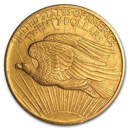 First Year of Issue in what is considered to be the most beautiful design in the 20th century's Renaissance of American coinage. Contains .9675 oz of Gold. Obverse: Shows Lady Liberty striding in front of the sun's rays with a fiery torch in her right hand and an olive branch in her left. Reverse: Features a majestic bald eagle in flight with "United States of America" and "Twenty Dollars" above. Designed by Augustus Saint-Gaudens and minted from 1907-1933. First year of issue without the motto "In God We Trust"