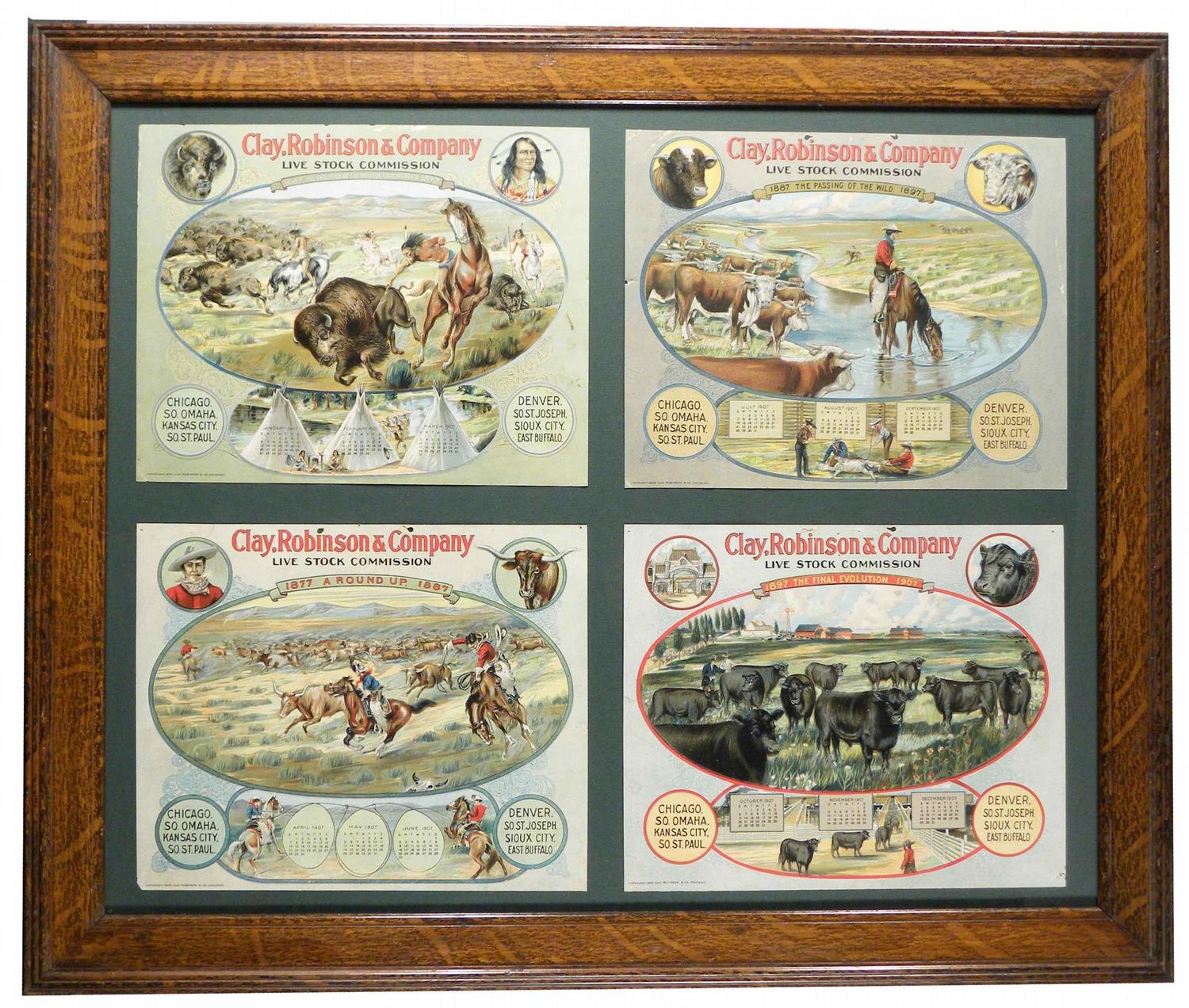 1907 Calendar for Clay Robinson Livestock Commission. Four pages depict cowboys, Indian, buffalo and longhorn cattle. A few dog ears otherwise very good condition. Each page measures 12 X 9 3/4 inches.