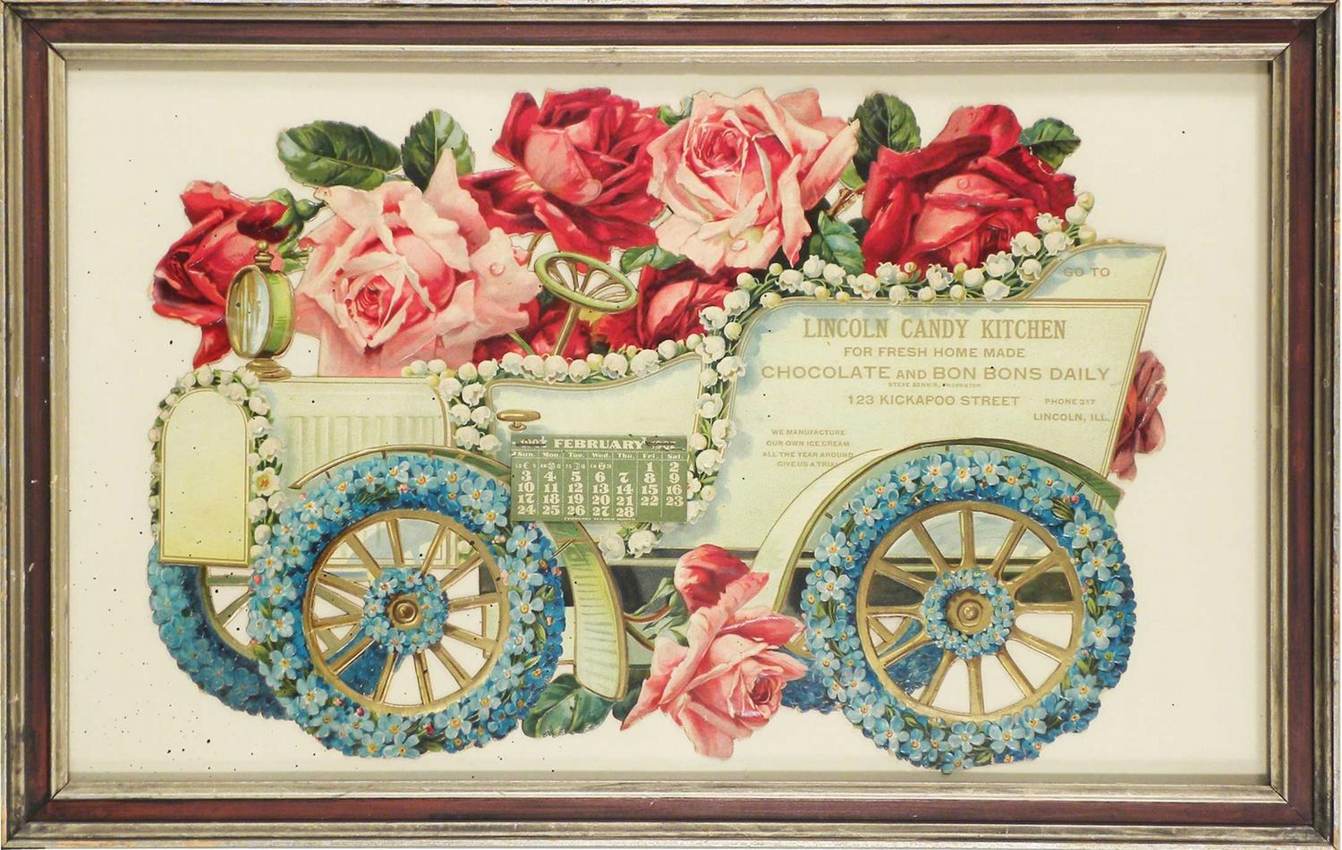 1907 Calendar for Lincoln Candy Kitchen, die cut embossed cardboard. Steve Bennis, proprietor Lincoln, Ill. Jan page missing. Paper loss at bottom wheels otherwise very good condition. 17 1/2 X 11 1/2 inches.