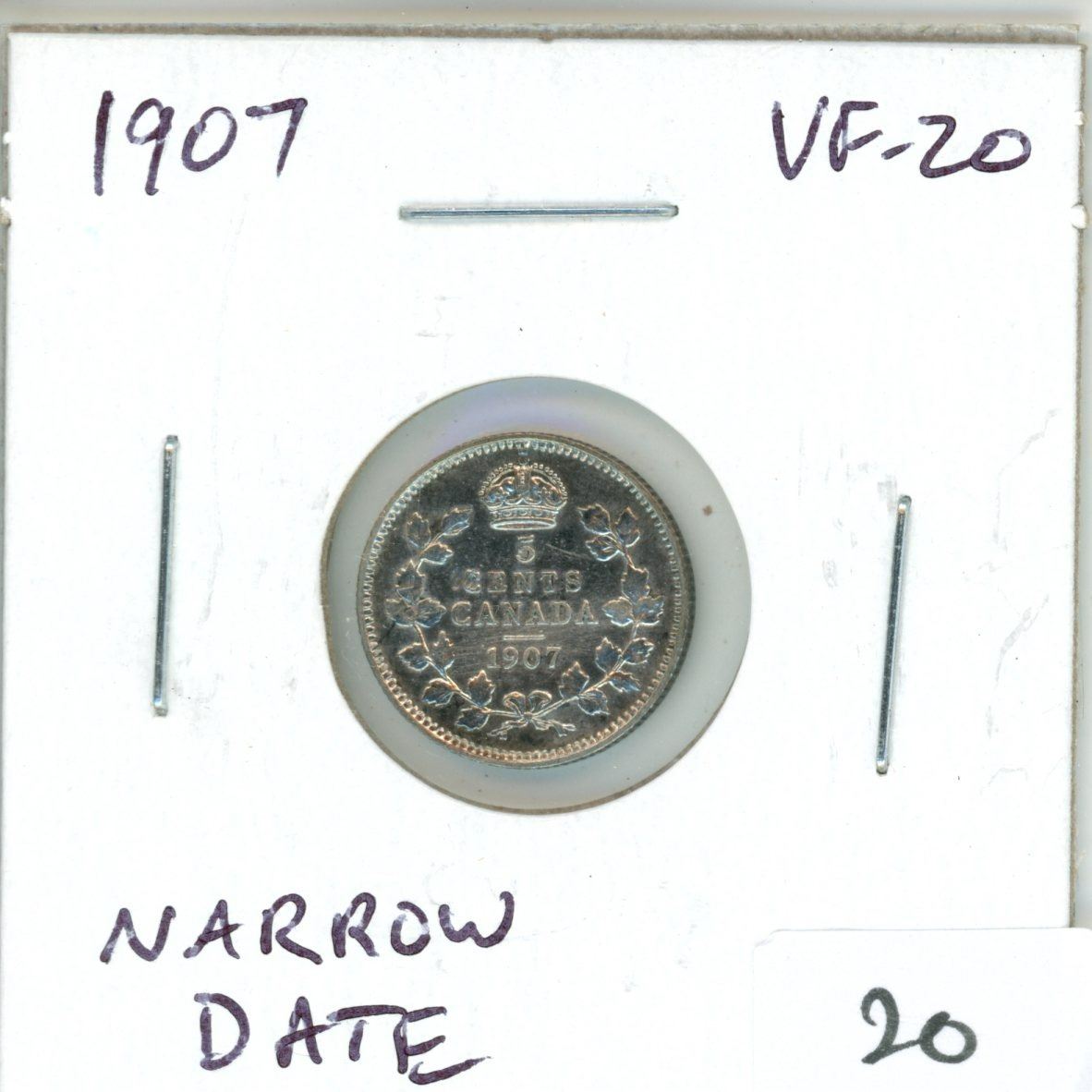 1907 Canadian Silver 5 Cents. Narrow Date variety. VF-20.