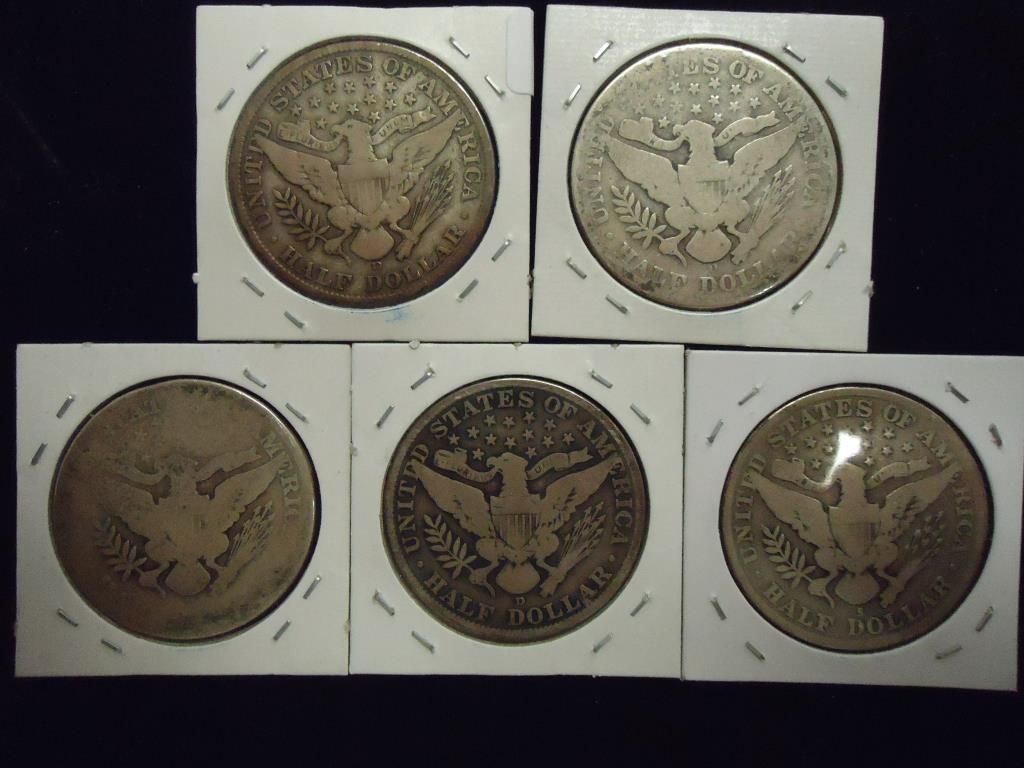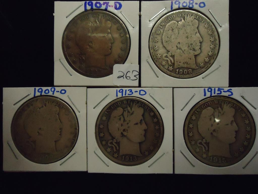 1907-D,08-O,09-O,13-D & 15-S BARBER HALF DOLLARS