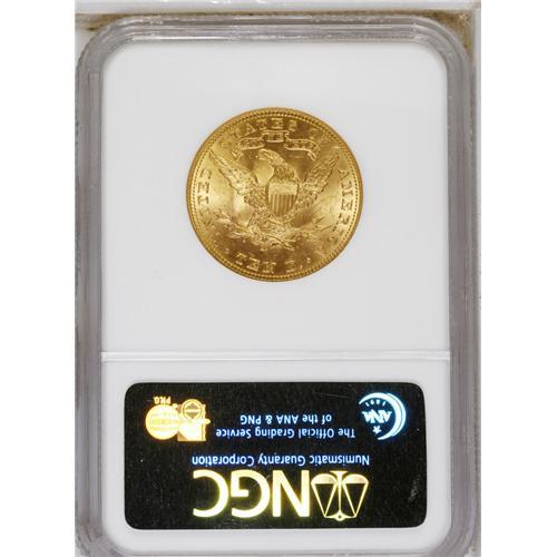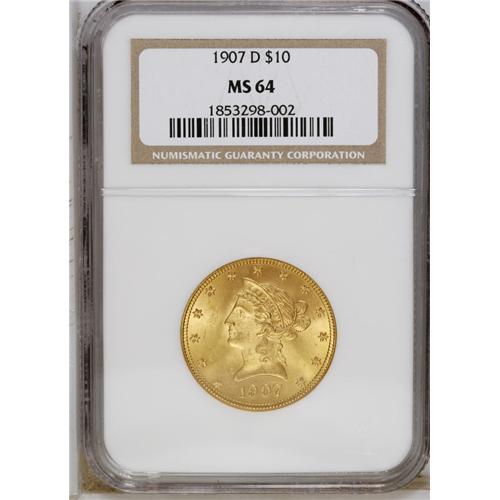 <B>1907-D $10 MS64 NGC.</B></I> The 1907-D is quite tough to locate in the better grades of Mint State. This near-Gem displays satiny peach-gold luster and well impressed design elements. A few minuscule marks define the grade. Census: 48 in 64, 6 finer (11/06).<BR><BR><b>Shipping:</b> Coin/Currency (<a target="_blank" href="http://www.heritageauctions.com/common/shipping.php">view shipping information</a>)
