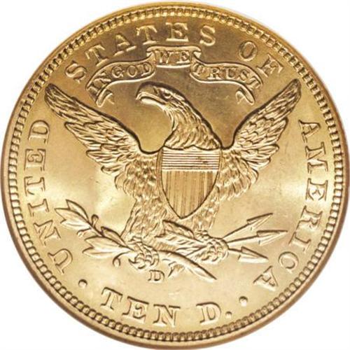 <B>1907-D $10 MS64 NGC.</B></I> Most certified Mint State 1907-D examples are at the low end of the grading scale. Near-Gems, such as the specimen in the present lot, can be challenging, and Gems are rare. Lustrous peach-gold surfaces exhibit sharply struck design elements. A few minute obverse marks define the grade. Census: 50 in 64, 6 finer (7/07).<BR><BR><B>Coin Engraver:</B> Christian Gobrecht<BR><BR><b>Shipping:</b> Coins & Currency (<a target="_blank" href="http://www.heritageauctions.com/common/shipping.php">view shipping information</a>)