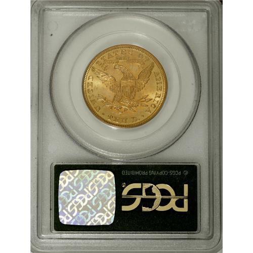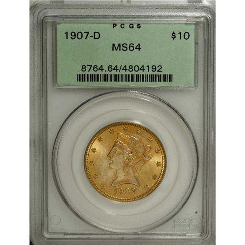 <B>1907-D $10 MS64 PCGS.</B></I> Variegated orange-gold and mint-green patina rests on lustrous surfaces. Typically well struck, and with only faint and scattered handling marks. Tough to locate in the better grades of Uncirculated. One for the type collector. Housed in a green-label holder. Population: 47 in 64, 0 finer (12/06).<BR><BR><b>Shipping:</b> Coins & Currency (<a target="_blank" href="http://www.heritageauctions.com/common/shipping.php">view shipping information</a>)