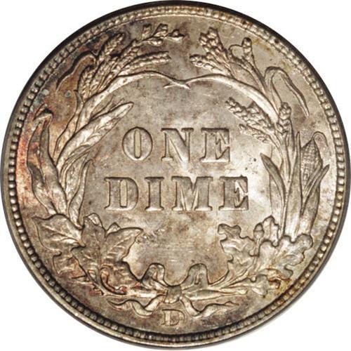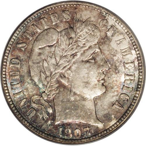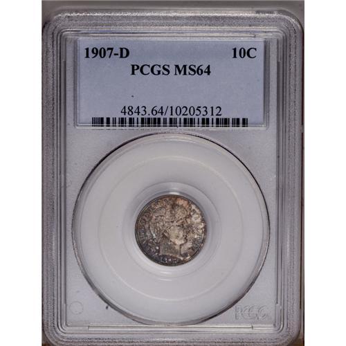 <B>1907-D<10C> MS64 PCGS.</B></I> Radiantly lustrous surfaces are visited by splotches of medium intensity sky-blue, lavender, and golden-brown toning on the obverse, and by a similar color scheme on the reverse that displays somewhat lighter hues. The design elements are sharply impressed, except for minor softness in the ribbon to the upper right of the bowknot. Minute marks on Liberty's cheek and neck define the grade. Population: 10 in 64, 12 finer (3/06).