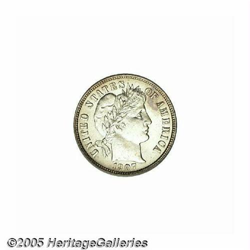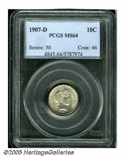 <B>1907-D<10C> MS64 PCGS.</B></I> This '07-D dime is nearly brilliant save for a splash of light tan and violet color in the upper right (facing) obverse quadrant. All of the design elements have been sharply impressed. A couple of minute marks on Liberty's neck define the grade. Population: 9 in 64, 11 finer (6/05).