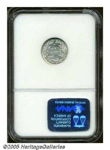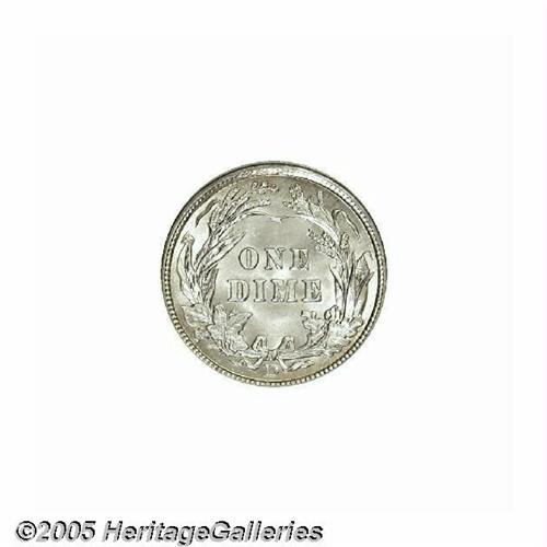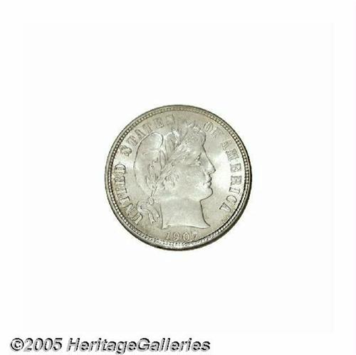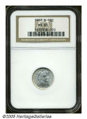 <B>1907-D<10C> MS65 NGC.</B></I> In spite of a mintage in excess of 4 million pieces, this issue is very difficult to locate in AU and Mint State grades. According to one account, four wagonloads of 1907 Dimes leaving the Denver Mint were lost in the Black Canyon. This piece is intensely lustrous with rich, billowy mint frost, and the essentially untoned surfaces are bright with an ice-white sheen. Neither the strike (which is razor sharp) nor the surfaces (which are smooth and obviously well cared for) are worthy of criticism. A conditionally scarce representative of this second-year Dime from the Denver Mint. Population: 10 in 65, 9 finer (6/05).
