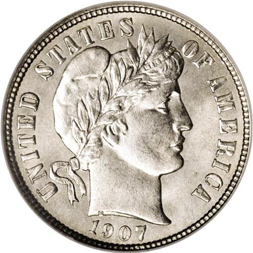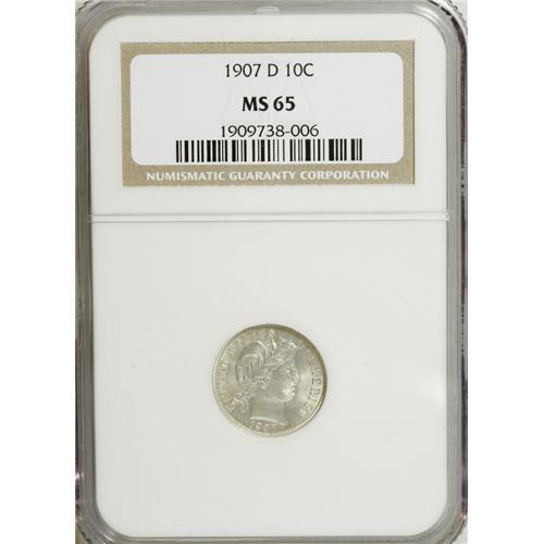 <B>1907-D 10C MS65 NGC.</B></I> Satiny silver-gray surfaces yield pleasing luster, and take on a whisper of incipient gold color around the borders. A well executed strike has resulted in exquisite definition on the design features, further enhancing the coin's outstanding eye appeal. Some faint roller marks are noted on the obverse. Census: 11 in 65, 9 finer (3/07).<BR><BR><b>Shipping:</b> Coins & Currency (<a target="_blank" href="http://www.heritageauctions.com/common/shipping.php">view shipping information</a>)