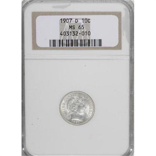 <B>1907-D 10C MS65 NGC.</B></I> The '07-D is much a much scarcer issue than its mintage of more than 4 million pieces would indicate. Only 12 pieces have been certified as Gems by NGC (8/07), with another nine in higher grades. Brilliant and sharply struck with frosty, untoned surfaces.<BR><BR><B>Coin Engraver:</B> Charles E. Barber<BR><BR><b>Shipping:</b> Coins & Currency (<a target="_blank" href="http://www.heritageauctions.com/common/shipping.php">view shipping information</a>)