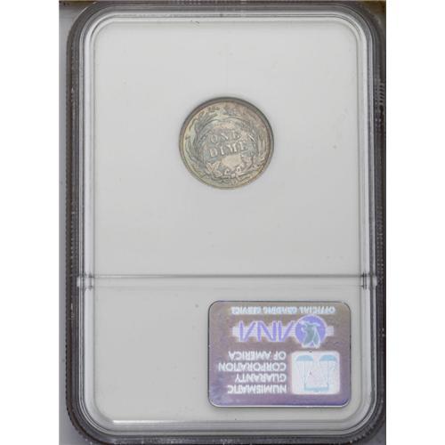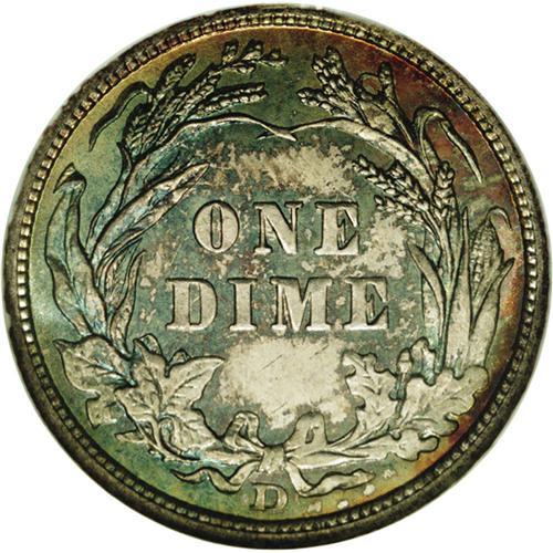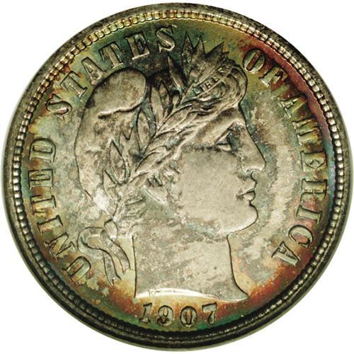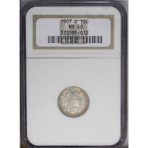<B>1907-D<10C> MS68 NGC.</B></I> We offered this same coin in our 1999 ANA Sale, at the time stating:<BR> The Denver Mint, the producer of more than half of our country's circulating coinage today, traces its lineage back to the private mint of Clark, Gruber & Co. The most respected and successful of the territorial mints that served the Colorado Gold Rush, this firm produced quarter eagles, half eagles, eagles, and double eagles in both 1860 and 1861. Despite their efforts, however, Clark, Gruber & Co. were unable to keep pace with the burgeoning population of Colorado. On the eve of the Civil War, the Colorado Territory boasted a population of twenty-five to thirty thousand inhabitants, with hundreds more arriving each day. As many of these people were miners, the existing supply of private coinage was woefully inadequate to prevent them from resorting to gold dust as a medium of exchange. Armed with these facts, the Colorado Territorial Convention of the Republican Party met on July 2, 1861 and drafted a resolution calling for a federal mint in Denver to supercede the activities of the local establishments. Amazingly, Clark, Gruber & Co. willingly admitted their shortcomings, supported the resolution, and even offered to sell their property to the federal government for the new mint. Despite rival claims for federal coinage facilities from Nevada (as benefactor of the Comstock Lode) and New York (as financial capital of the country), as well as the enormous wartime deficit, Congress passed the bill that established a branch mint in Denver, Colorado on April 21, 1862. After a year of the usual red tape and political jargon, on April 16, 1863, Uncle Sam purchased the Clark, Gruber & Co. building for the lofty sum of $25,000. After more than five months of extensive remodeling, the new mint was apparently ready to begin operations. For unknown reasons, however, Congress changed its mind at the last minute and opened the Denver facility merely as an assay office on September 24. It languished in this inglorious, although necessary role until early 1906, when Congress finally approved its operations as a full-fledged branch mint.<BR> Among the early products of the Denver Mint, its silver coinage is well respected for its scarcity in the higher Mint State grades. A primary example of this is its 1907-D Barber dime issue, whose finest certified survivor we are delighted to highlight here. A boldly impressed superb gem, every last detail on both the obverse and the reverse stands out in stark contrast to the impeccably smooth fields. The obverse exhibits mottled slate-gray patination across its central area that deepens to variegated hues of red, orange, yellow, gold, and blue about the borders. The reverse carries a more extensive, although still incomplete, blanket of ice-blue patination with delicate highlights of rose and gold along the right periphery. With blazing underlying frost and swirling cartwheel effect, this gorgeous piece is a fitting monument to the rich history of the Denver Mint. This is the only example to attain an MS68 grade designation from either NGC or PCGS, with none finer (3/06).