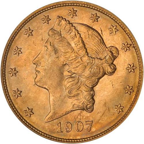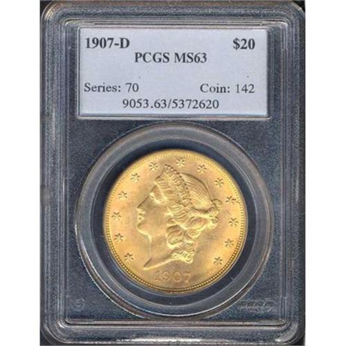 <b>1907-D $20 Liberty. PCGS graded MS63.</b> A nice yellow gold piece with notable luster throughout. Some bagmarks in the fields are the main grade-limiting features <b>(PCGS # 9053)</b> <i>