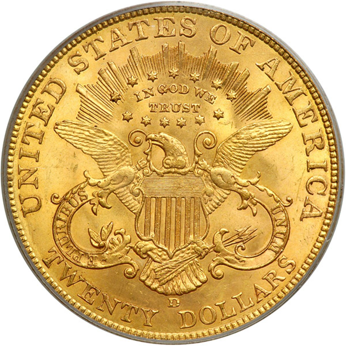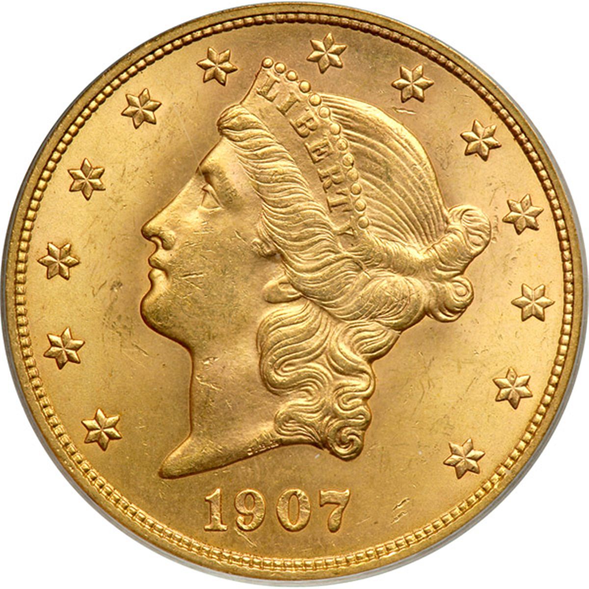 1907-D $20 Liberty. PCGS graded MS-64. Lovely golden toning. Nice and problem-free with flaxen to shimmering-gold metallic patina over each side. An eye-appealing, radiant specimen. Furthermore, the dies left their rigid impression behind without the least weakness or imprecision on the main devices (PCGS # 9053) .