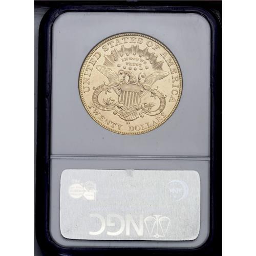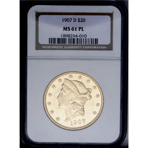 <B>1907-D<$20> MS61 Prooflike NGC.</B></I> Nicely struck with medium reflectivity. The brassy surfaces have their share of marks, though Liberty's cheek is remarkably clean for the grade. Among prooflikes, Census: 3 in 61, 7 finer (7/06).<BR><I>From The New York Eye Appeal Collection.</B></I>