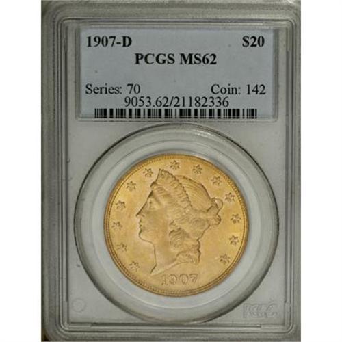 <B>1907-D $20 MS62 PCGS.</B></I> PCGS Population (535/1089). NGC Census: (508/818). Mintage: 842,250. Numismedia Wsl. Price for NGC/PCGS coin in MS62: $758. (#9053)<BR><BR><B>Coin Engraver:</B> James B. Longacre<BR><BR><b>Shipping:</b> Coins & Currency (<a target="_blank" href="http://www.heritageauctions.com/common/shipping.php">view shipping information</a>)