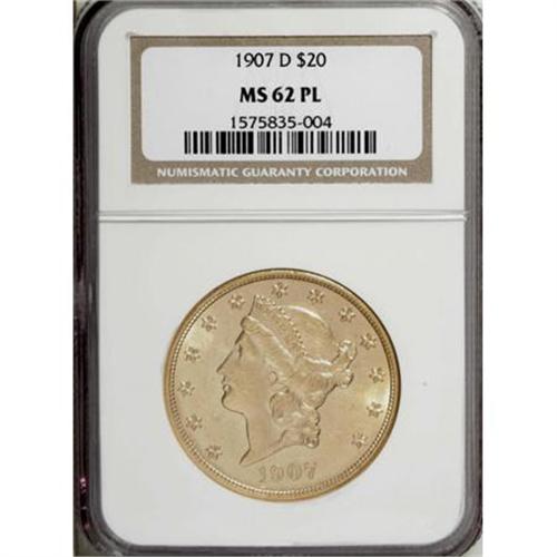 <B>1907-D $20 MS62 Prooflike NGC.</B></I> Boldly impressed with strongly reflective, lightly abraded yellow-gold fields. The devices are clean for the grade. An attractive example, only the fifth Prooflike representative of this issue offered by Heritage. Census: 3 in 62 Prooflike, 6 finer (7/07).<BR><BR><B>Coin Engraver:</B> James B. Longacre<BR><BR><b>Shipping:</b> Coins & Currency (<a target="_blank" href="http://www.heritageauctions.com/common/shipping.php">view shipping information</a>\)