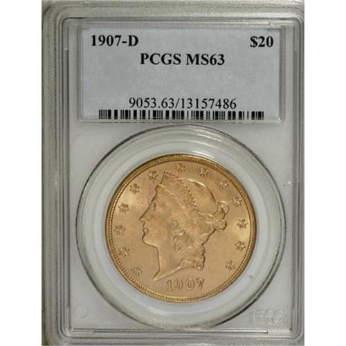 <B>1907-D $20 MS63 PCGS.</B></I> PCGS Population (528/593). NGC Census: (379/474). Mintage: 842,250. Numismedia Wsl. Price for NGC/PCGS coin in MS63: $2,300. (#9053)<BR><BR><B>Coin Engraver:</B> James B. Longacre<BR><BR><b>Shipping:</b> Coins & Currency (<a target="_blank" href="http://www.heritageauctions.com/common/shipping.php">view shipping information</a>)